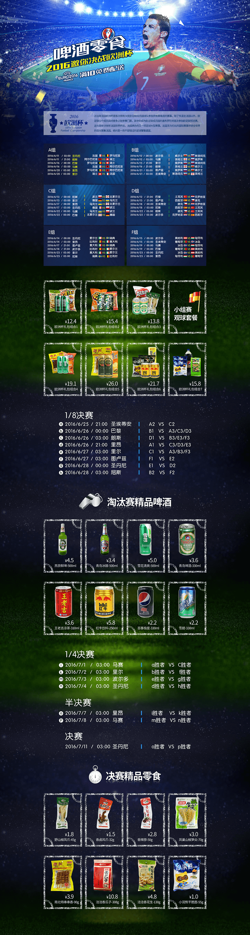 欧洲杯主题的啤酒零食网站PSD模板 来源:未知 作者: 语言:中文简体 颜色:藏青色 大小: 59MB 点击次数: 发布时间:2016-07-15 12:59:32 去下载 藏青色欧洲杯主题的啤酒零食网站PSD模板,网站顶部全屏的欧洲杯足球场内景,C罗。紧接着是6组比赛阵营以及时间。下面是草地作为背景的,用个性的足球场白框为边框的零食列表。 TAGS: 欧洲杯 主 题的 啤酒 零食 网站 PSD 模板 藏 下载 上一篇: 高大上的木业家具公司网站PSD模板 下一篇: 网页设计公司单页(single page)网站PSD模板