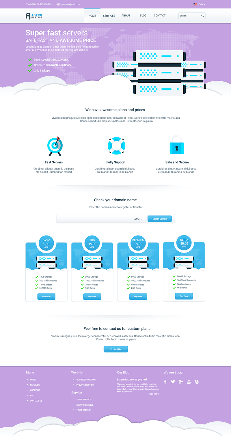 虚拟主机,服务器网站PSD模板 来源:未知 作者: 语言:英文 颜色:紫色 大小: 8MB 点击次数: 发布时间:2017-03-15 17:37:03 去下载 服务器与域名销售租赁公司网站PSD模板——ASTRO,紫色风格,英文版。一共包括首页、价格列表页、域名查询与购买页面等8个页面。设计风格扁平化,底部和banner下面都是剪纸云彩风格。效果还是不错的。使用时注意下面几点: 字体 请务必下载并安装谷歌字体Roboto,否则编辑的时候,文字字体识别不了。 模板 ASTRO模板是完全PSD分层模板,每个元素都是一层,并且分组明确。请选择要编辑元素的图层 版权 预览中的图像仅用于演示,并且它们包含在PSD文件中。请勿直接用于商用。 TAGS: 服务器网站PSD模板 下载 上一篇: 扁平化手机站和pc站PSD模板 下一篇: Uihero单页面网站PSD模板
