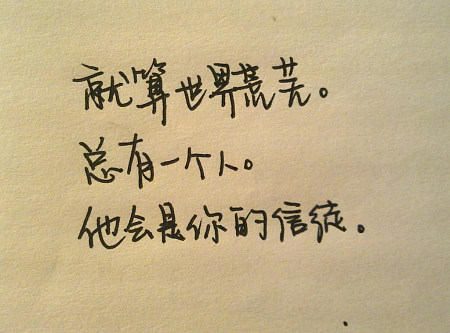 即使世界荒芜,也有一个人会是你的信徒 来源:未知 作者: 点击次数: 发布时间:2014-11-03 10:18:26 Even if the world is barren,there is also a person would be you of believers. 即使世界荒芜,也有一个人会是你的信徒。 TAGS: 荒芜 信徒 上一篇: 服务器换IP导致搜索引擎抓取异常 下一篇: 致我的爱人