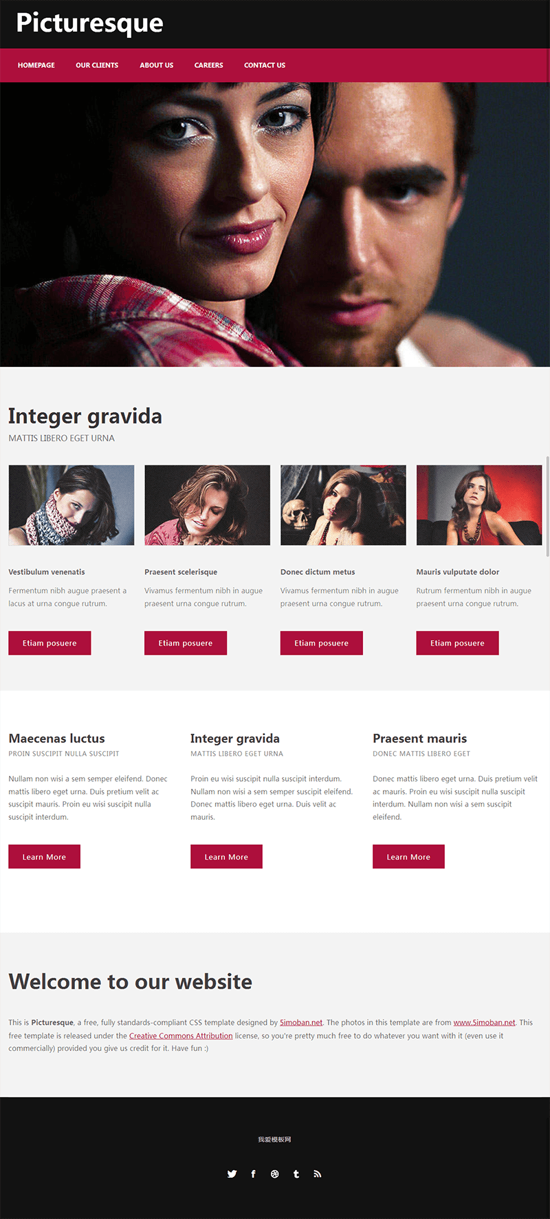 粉红色个人博客网站html静态模板 来源:未知 作者: 语言:英文 编码:utf-8 颜色:粉红 大小: 0KB 点击次数: 发布时间:2017-09-25 23:06:23 去下载 去预览 粉红色卡哇伊的个人博客网站HTML静态网页模板,只有一个首页,没有加任何特效。采用了fontAwesome字体图标。“Integer gravida”这块的图片可以做成点击小图,弹出大图的效果,详见fancybox弹出框插件。 TAGS: 个人博客静态模板 下载 预览 上一篇: 个人博客响应式html静态网页模板 下一篇: 粉红色英文个人博客html静态网页模板