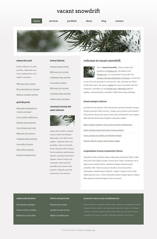白茫茫雪堆三列网页模板 来源:未知 作者: 语言:英文 编码:utf-8 颜色: 大小: 0KB 点击次数: 发布时间:2017-11-13 22:35:41 去下载 去预览 非常简洁洁白的白茫茫雪堆风格的三列网页模板,这个模板非常适合作为个人博客,所以我把它添加到了个人博客模板的分类下。作为首页,适当添加图片可能比较好看。这个模板除了banner都是文字,有点单调。 TAGS: html模板 下载 预览 上一篇: 绿色大按钮风格的个人博客静态模板 下一篇: 抽丝女性背景个人博客网站HTML模板