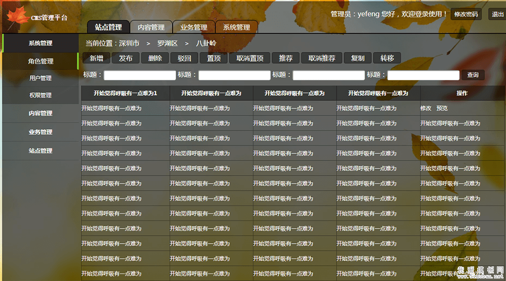 唯美的秋天风格CMS后台管理html模板 来源:未知 作者: 语言:中文简体 编码:utf-8 颜色:黄色 大小: 1000KB 点击次数: 发布时间:2018-08-29 09:49:59 去下载 去预览 浅黄色秋天落叶风格的CMS后台管理系统html模板,登录界面枫叶飘落,浅黄色背景,半透明+大投影的登录窗口,很唯美。而主界面页是半透明的窗口+秋天落叶背景。 TAGS: html模板 下载 预览 上一篇: 蓝色网站后台管理系统html模板 下一篇: CloudSoft网站后台管理系统响应式模板