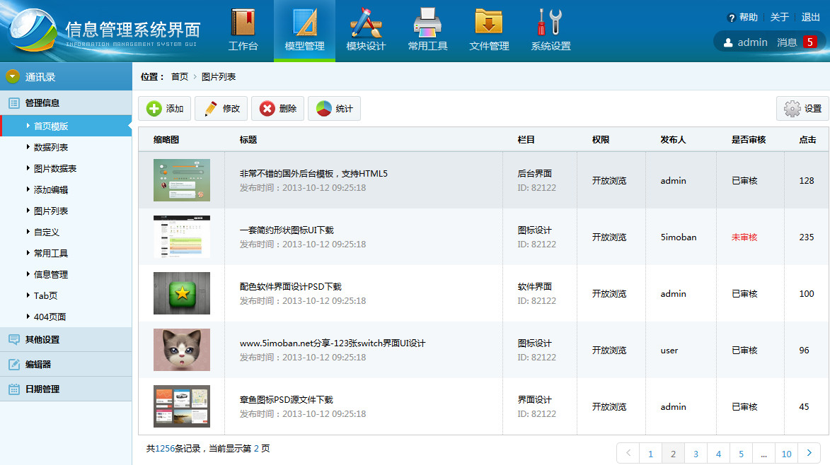 蓝色信息管理系统静态网页模板,功能非常多,界面简洁美观,主导航各个栏目采用了图标的形式。左侧为可折叠面板菜单。工作台(主页面)采用了html5最新技术--svg画的圆形数据统计,常用工具也是小图标形式。模型管理是图文列表形式,模块设计为图片列表形式。文件管理模拟windows 7的“我的电脑”操作界面将文件分类做成盘符形式,并用比例显示当前文件占用的空间大小。系统工具继承了KindEditor编辑器。还有非常可爱的404错误页面。登陆界面是蓝色的背景,缓缓移动的云,界面做的真的挺好。