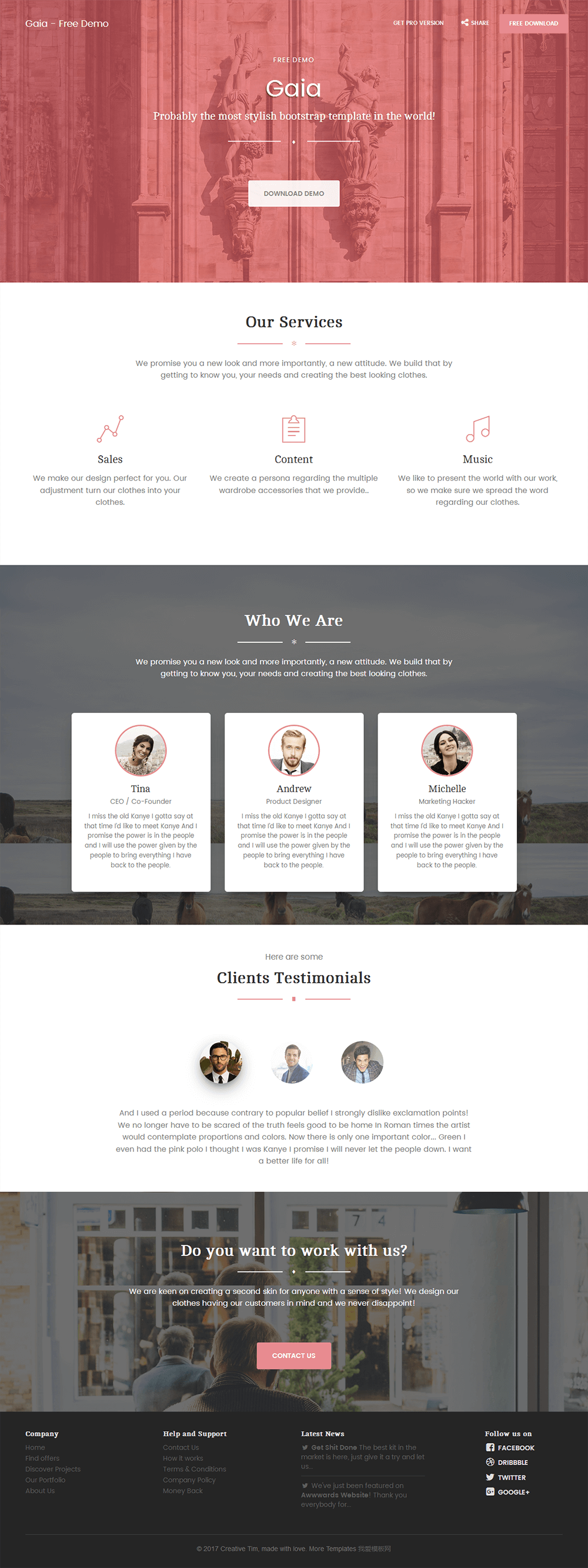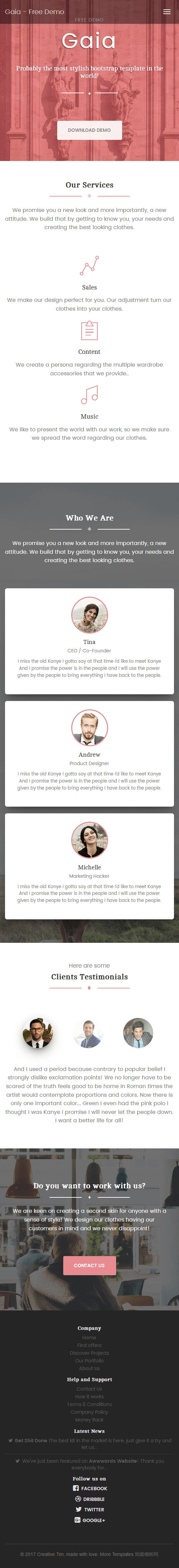 Gaia粉红色响应式网页模板 来源:未知 作者: 语言:中文简体 编码:utf-8 颜色:粉红 大小: 2MB 点击次数: 发布时间:2017-06-27 17:51:44 去下载 去预览 粉红色的基于bootstrap和font awesome的Gaia响应式网页模板,自适应各种尺寸的屏幕,“who are we”等栏目的背景具有视差效果。可以用来作为企业站,也可以做个人博客的模板都可以。 TAGS: bootstrap模板 响应式模板 下载 预览 上一篇: 名片设计公司网站HTML模板 下一篇: 机票预订步骤条html模板
