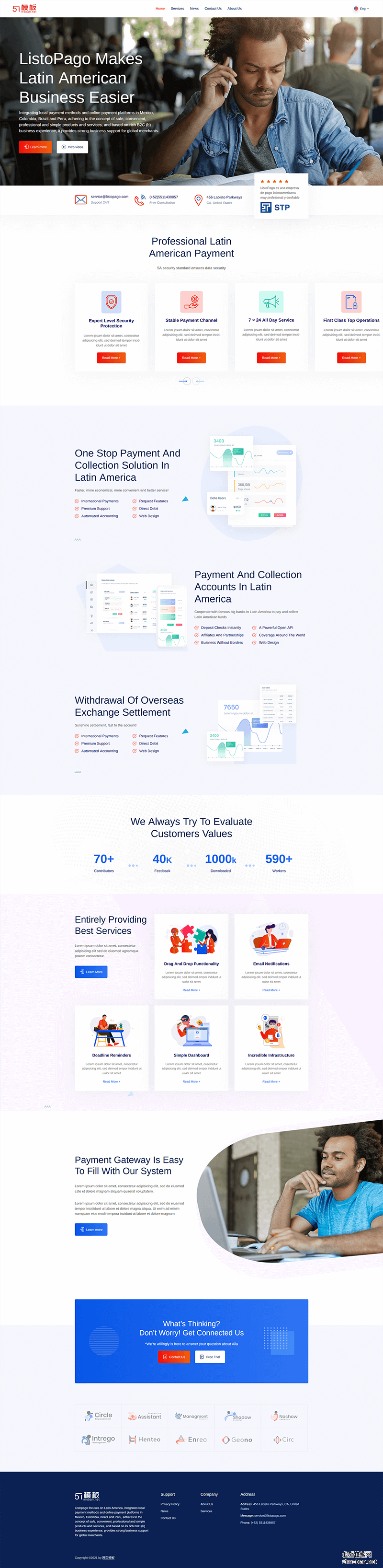 我爱模板网推荐科技公司网站html5响应式静态模板,自适应各种分辨率的屏幕。本套模板设计精美,动画效果多,页面也比较多,包括首页、列表页等共20个页面。而且,还是多语言。每个页面打开后,还有炫酷的加载动画。页面设计扁平化,清新淡雅。首页Professional Latin American Payment栏目支持鼠标拖拽左右滑动,鼠标浮动上去还有动画效果。首页每个模块都有小动画,非常不错。按钮前都有个性化的小图标,鼠标悬浮上去,图标会上下切换。