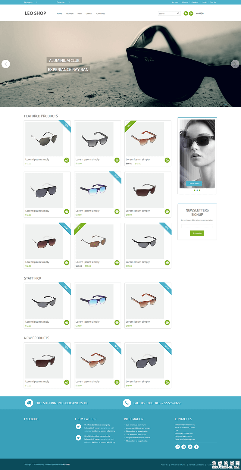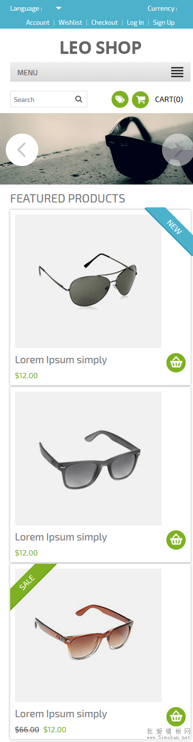 蓝色为主色调的兼容各屏幕分辨率的墨镜商城html模板,首页全屏大图轮播+侧边栏轮播,点击产品后进入详情页,详情页的效果和淘宝差不多,产品大图具有放大效果,而且带四个缩略图,产品价格是采用的别致的自定义字体。侧边栏是筛选,包括价格、款式等。还有购物车页面、404页面、登录注册页面等等。