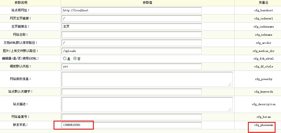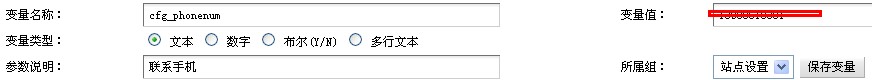 怎么办呢,自定义变量,对了。dedecms的自定义变量的定义和调用非常方便,不像phpcms,得安装插件,而且使用也不方便。下面就以“联系手机”来仔细详解如何定义和调用织梦自定义变量: