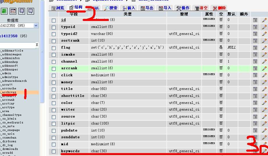第一步、打开数据库,找到keywords字段,修改60为120,如下图: