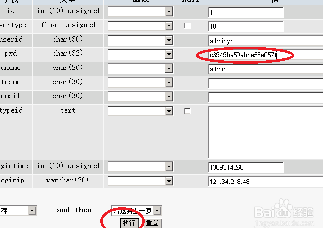5、复制“c3949ba59abbe56e057f”,粘贴到上图的红圈处,点击执行,“c3949ba59abbe56e057f”是 123456 的md5加密结果。点击执行之后,再进入后台,输入账号,密码为“123456”,成功登陆。如果,想把密码改成其他的,可以进入:系统-->系统用户管理: