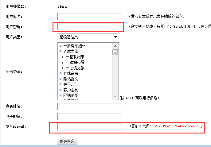 6、点击后面的“修改”,如下图,将密码改成自己想要的密码,同时将“安全验证串”输入一遍,点击“保存用户”即可: