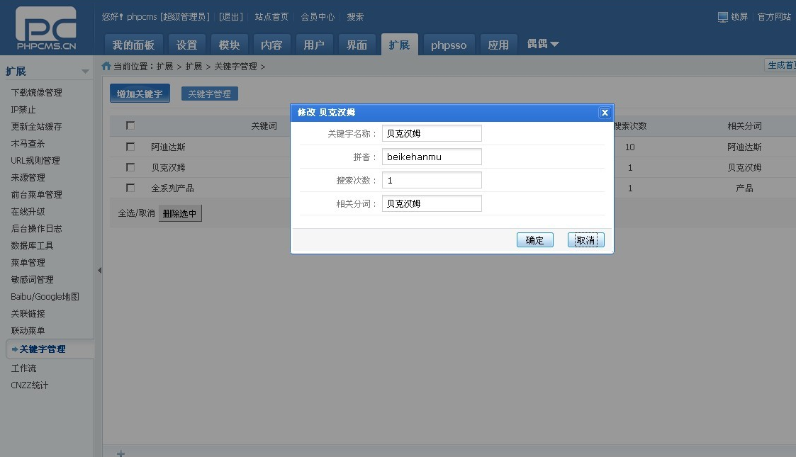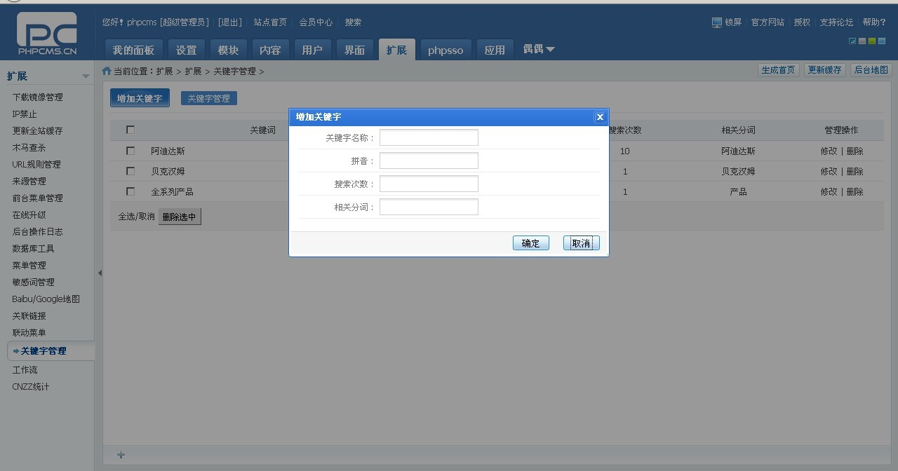 将上面这段代码复制到头部的任意位置,即可显示5个关键词并按搜索次数最多的前5个显示。下面是后台增加关键词管理的操作方法。我将管理菜单放在扩展的栏目下,其它朋友可以根据知道的需求,增加到各自的栏目下,先上图,有图有真相。