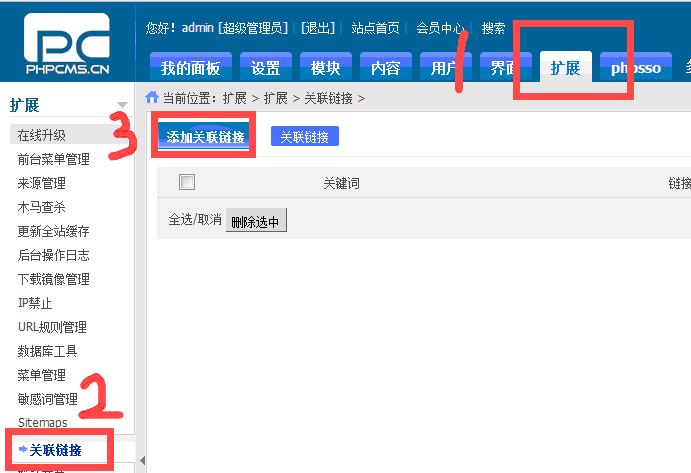第一步:后台 -> 扩展 -> 关联链接 -> 添加关联链接: