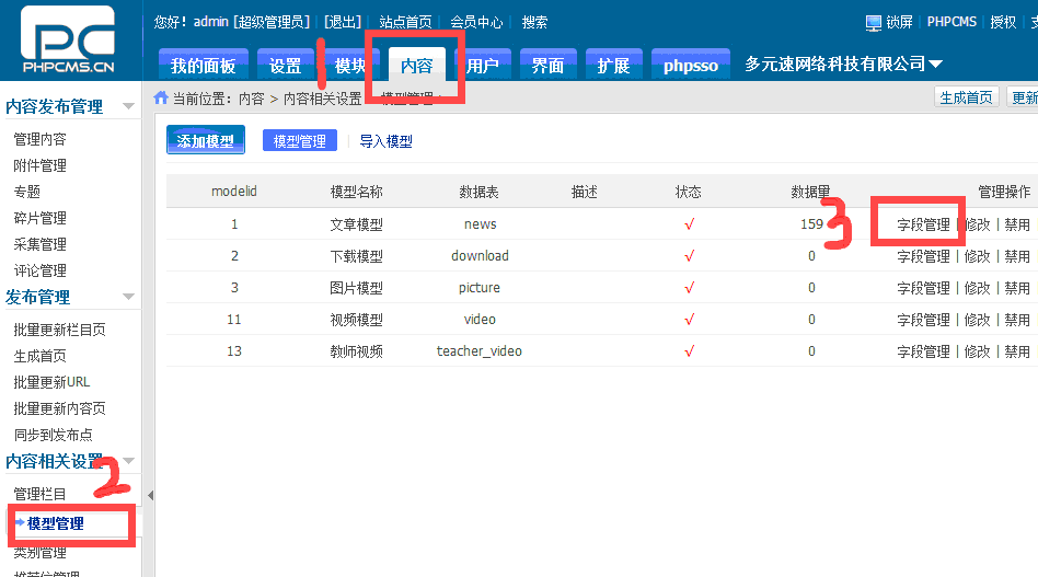 第三步:内容 -> 模型管理 ->字段管理,这里的“字段管理”,肯定要对应自己希望修改的模型,例如:文章模型: