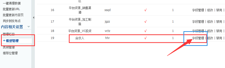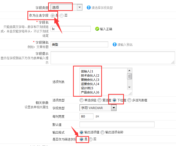2、在后台对应的模型管理里面新建需要筛选的字段,筛选可以是下拉框、单选按钮等,如下图: