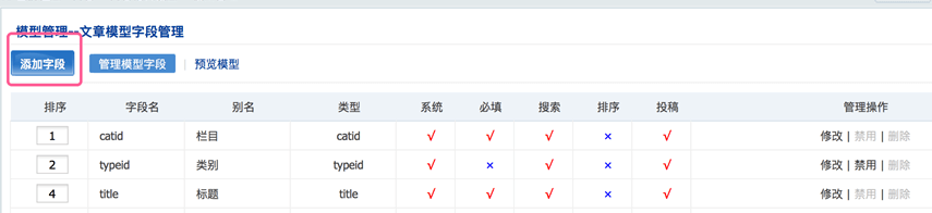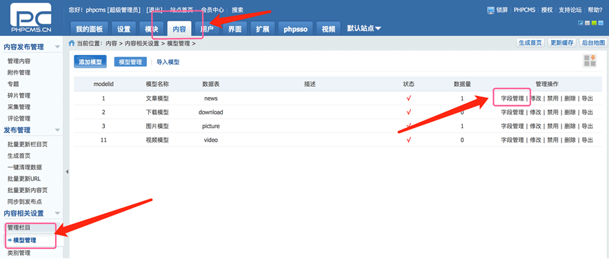 先点内容,再点模型管理 再找到你需要添加字段的模型,我们举例文章模型;