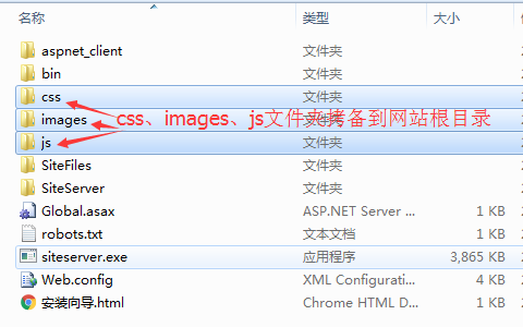 第一步就是把切图人员给过来的css、images和js文件夹拷备到安装好了的SiteServer CMS系统根目录下,如下图所示: