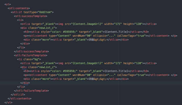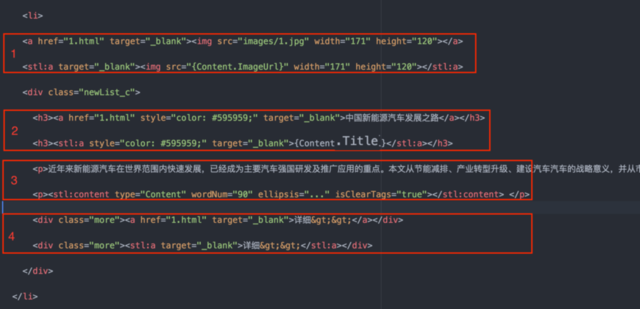 解决了偶数项新闻的背景色问题,接下来就是要进行每一篇具体新闻的STL标签替换。为了方便大家对比嵌套前后的差别,特意把替换前后的代码列在一起,用红框框起来了,总共4组,如下图所示: