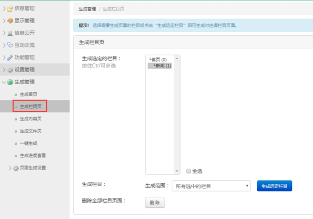 如上图所示,把刚才嵌套好的 “新闻列表模板” 和 “新闻” 栏目匹配好,然后再去生成页面:
