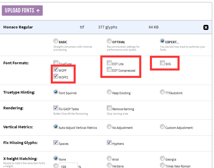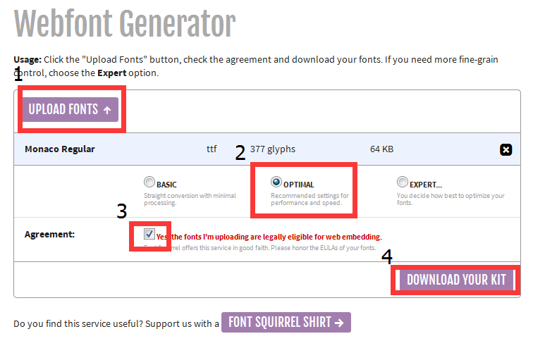 点击“upload fonts”按钮上传文件--->选择要转换的类型--->点击“ Yes, the fonts I'm uploading are legally eligible for web embedding.”,出现下载按钮--->点击“download your kit”,即可将转换后得到的字体下载下来。如下图: