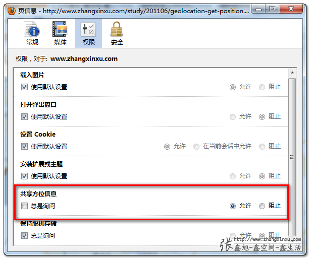 点击地址栏前面的网站小图标 → 点击更多信息 → 权限 → 共享方位信息 → 阻止,具体步骤参见下面几张截图。