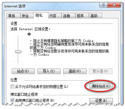 对于IE9浏览器,Internet选项 → 隐私 → 位置(清除站点),如下截图: