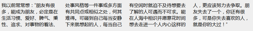 我以前常常想:“朋友有很多,能成为朋友,必定是在生活习惯、爱好、脾气、秉性、追求、对事物的看法、处事风格等一件事或多方面有共同点或相似之处,何其难得。可碰到自己每当安静下来就想起的人,每当自己有空闲时就迫不及待想要去了解的人可遇而不可求。能在人海中相识并愿意花时间想去走进一个人内心这样的人,更应该努力去争取。朋友失去了一个,你还有很多,可是你失去喜欢的人,就是你的大过!”