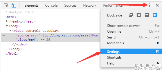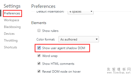 2、选择“Preferrences”,找到“Elements”下面的“Show user agent shadow DOM”,如下