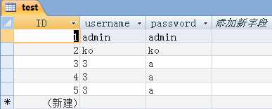 首先在Access数据库Database.mdb中存在着用户信息表test: