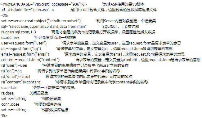 表单是做好了,但是还需要后台程序的支持,一起来使用ASP编写一个添加留言处理程序,添加留言代码: