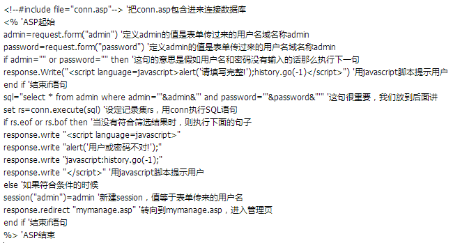 这样,用户在admin.asp页面中输入用户名和密码后,就把用户名和密码值传给checkpass.asp处理,当用户名和密码的值和数据库中的字段相匹配时,就进入mymanage.asp这个管理页面,同时建一个session,这个session的会话变量将在后面起作用,下一节就明白了。