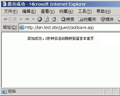 然后在页面中添加提示信息,比如:“您的留言已经成功提交,2秒钟后将自动返回留言本首页”