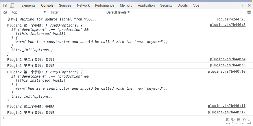 从中可以发现我们在plugin1中的install方法编写的三个console都打印出来,第一个打印出来的是Vue对象,第二个跟第三个是我们传入的两个参数。