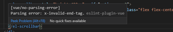 vue老是提示:[vue/no-parsing-error] Parsing error: x-invalid-end- 来源:我爱模板网 作者: 类型:图文教程 点击次数: 发布时间:2020-10-31 16:32:37 vue老是提示[vue/no-parsing-error] Parsing error: x-invalid-end-tag.eslint-plugin-vue,但是标签都能匹配上啊,如下图: 去掉这个烦人的提示有两个方法: 方法一、File->Preferences->Settings,搜索“vetur.validation.template”,将前面的勾去掉,如下: 方法二、在根目录的eslint配置文件“.eslintrc.js”文件中的“rules”加上下面这句: "vue/no-parsing-error": [2, { "x-invalid-end-tag": false }] 如下图: TAGS: vue eslint 上一篇: vue中$refs, $emit, $on, $once, $off的使用,vue事件总线eventBus 下一篇: element ui sortable实现中文按拼音首字母进行排序