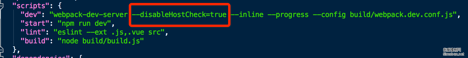 同样的原理,可以在package.json文件修改scripts命令:webpack-dev-server --disableHostCheck=true