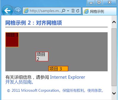 这使 Internet Explorer 10 在 Item 3 的上面绘制 Item 2。你可以查看此页面。(Internet Explorer 10 对于正确显示此页面来说是必需的。)跨越网格项