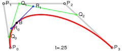 为建构高阶曲线,便需要相应更多的中介点。对于三次曲线,可由线性贝塞尔曲线描述的中介点Q0、Q1、Q2,和由二次曲线描述的点R0、R1所建构: