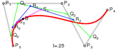 对于四次曲线,可由线性贝塞尔曲线描述的中介点Q0、Q1、Q2、Q3,由二次贝塞尔曲线描述的点R0、R1、R2,和由三次贝塞尔曲线描述的点S0、S1所建构: