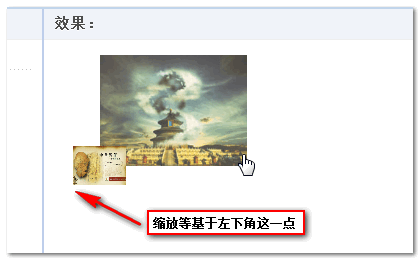 -webkit-transform-origin: bottom left;则,坐标中心点就是左下角位置。于是动画(例如图片收缩)就是基于图片的左下角这一点了:
