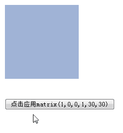 实际上transform: matrix(1, 0, 0, 1, 30, 30);就等同于transform: translate(30px, 30px);. 注意:translate, rotate等方法都是需要单位的,而matrix方法e, f参数的单位可以省略。