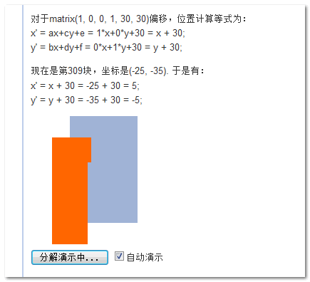 于是,变换后的x坐标就是ax+cy+e = 1*0+0*0+30 =30, y坐标就是bx+dy+f = 0*0+1*0+30 =30.