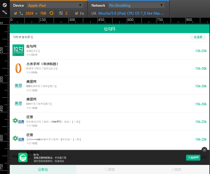 这个规则是一套基本的适配规则,对于这种简单app来说已经足够,同时它也是后面要说的rem布局的基础。另外对于拉勾这种app可能需要额外媒介查询对布局进行调整的就是小屏幕设备。举例来说,因为现在很多设计稿是根据iphone6的尺寸来的,而iphon6设备宽的逻辑的像素是375px,而iphone4的逻辑像素是320个像素,所以如果你根据设计稿做出来的东西,在iphone4里面可能显示不下,比如说拉钩网底部那个下载框,你对比看下就知道了