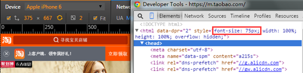 最后还有一个情况要说明,跟网易一样,淘宝也设置了一个临界点,当设备竖着时横向物理分辨率大于1080时,html的font-size就不会变化了,原因也是一样的,分辨率已经可以去访问电脑版页面了。