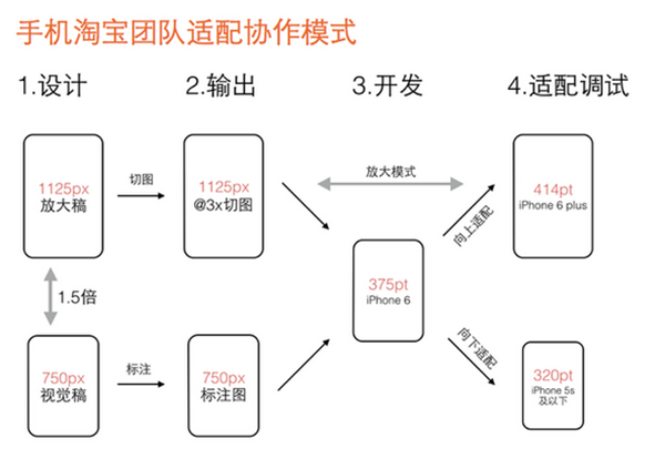 6. 如何与设计协作前端与设计师的协作应该是比较简单的,最重要的是要规范设计提供给你的产物,通常对于前端来说,我们需要设计师提供标注尺寸后的设计稿以及各种元素的切图文件,有了这些就可以开始布局了。考虑到Retina显示屏以及这么多移动设备分辨率却不一样的问题,那么设计师应该提供多套设计稿吗?从网易和淘宝的做法来看,应该是不用了,我们可以按照设计稿,先做出一套布局,按照以上方法做适配,由于是等比适配,所以各个设备的视觉效果差异应该会很小,当然也排除不了一些需要媒介查询特殊处理的情况,这肯定避免不了的。下面这张图是淘宝设计师分享的他们的工作流程:
