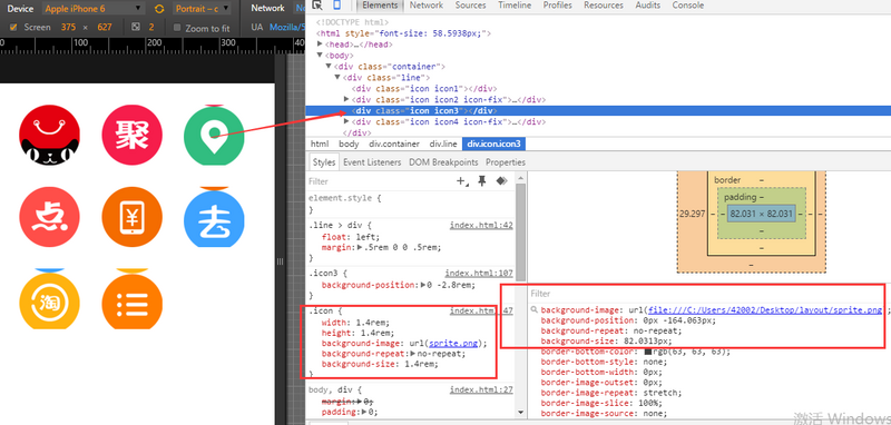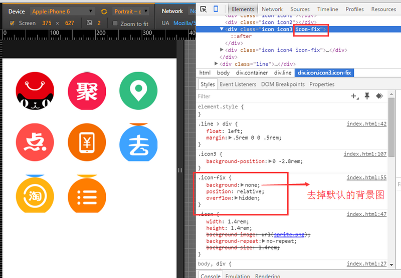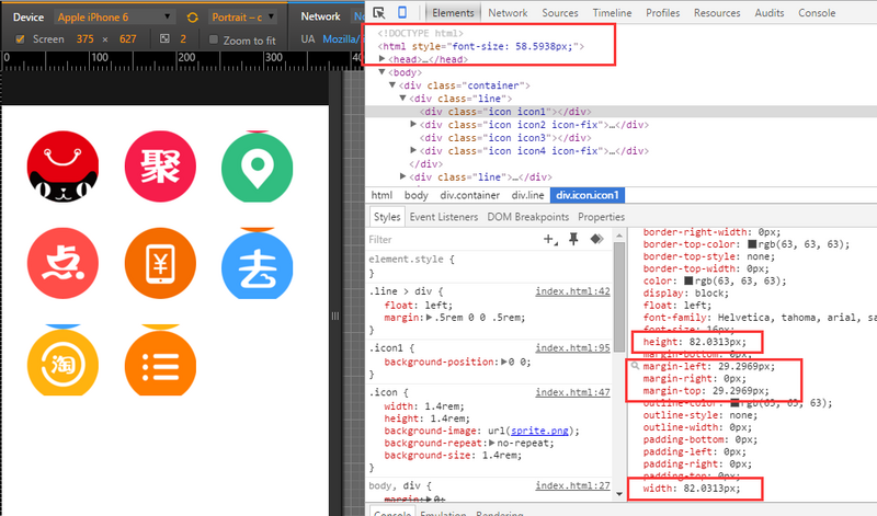 可以看出来:html的font-size动态根据deviceWidth改变,图标的宽高、边距等也根据font-size动态按比例变化,大功告成了?不对,相信机智的你已经看到貌似在iPhone6的下有的图标背景错位了。。是的,这暴露出了一个背景使用雪碧图的一个弊端(由于font-size小数点太多,计算出实际背景图大小background-size跟背景图位置background-position时浏览器精度不够可能就会出现位置的偏差(我猜的),这个后面还会详细讲解决方案)