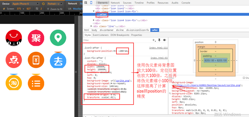 上面已经发现了,通过换算rem设置background-size跟background-position的时候,在一些手机型号下会出现背景图错位的情况,可是如果不用rem设置的话,又不能达到适配的目的。(background-size、background-position的rem换算方法跟前面讲的宽高设定一样,都是设计稿尺寸(这时应该是css精灵图片的原始尺寸)除以100倍)