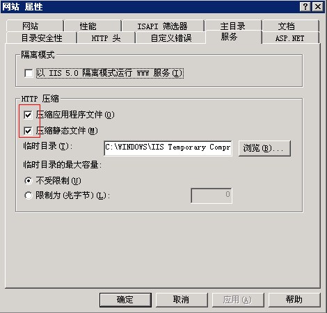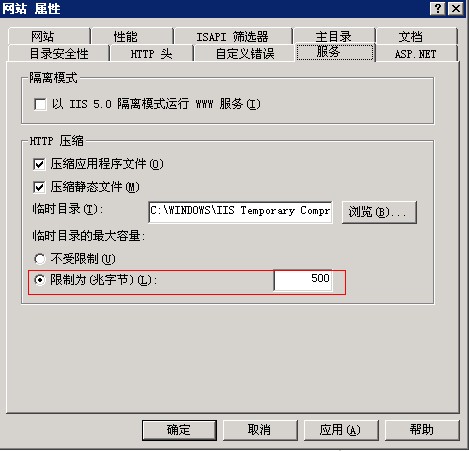因此在您设置后如果您的CPU占用很高,请在IIS--网站--属性--服务里,取消HTTP压缩的勾,并重启IIS。(建议:VPS上超过10个站的不要开启该压缩功能)