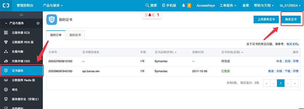 1).首先进入阿里云服务器,选择产品与服务->证书服务,后点击购买证书: