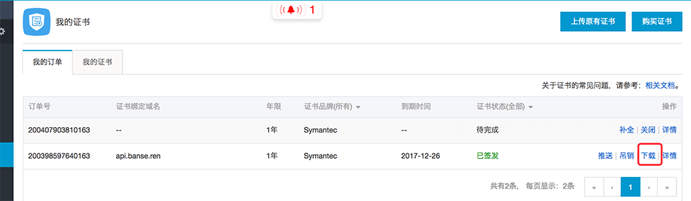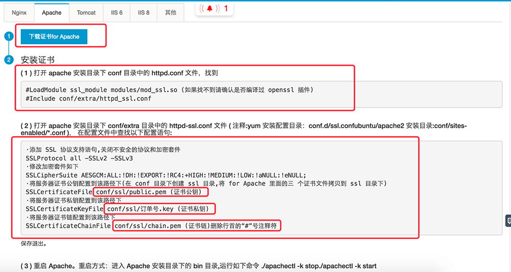 4).点击下载证书,我这边是Apache的服务器,所以我下载的是Apache的证书,下面画圈的都是重点;