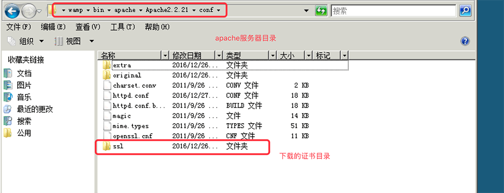 1).首先把刚才下载的证书解压到conf文件夹中(看下图),我这边为了方便管理,建立一个ssl文件夹用于存放ssl证书的