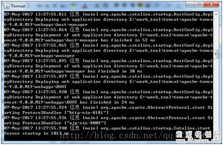 2,win版本的直接打开压缩包下面,bin目录里面的startup.bat文件,双击运行。就会出现这样的界面,说明你的Tomcat已经成功跑起来了。